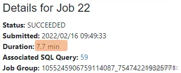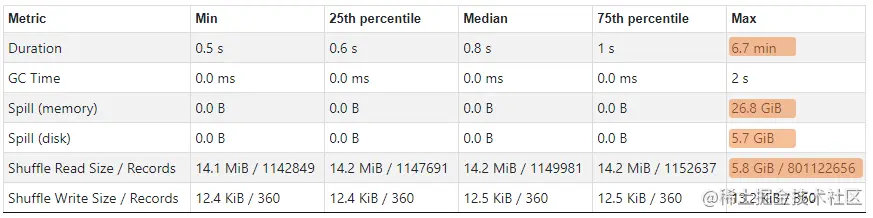 The example below shows a job execution with skewed partition. As you can see, the skewed partition has 5.8GB data while the other partitions only have less than 20MB data. It takes 6.7 minutes to run the task of the skewed partition while less than 1 second is used to run the tasks of the other partitions. The long running time of the task with skewed partition makes the total job execution time to be 7.7 minutes.