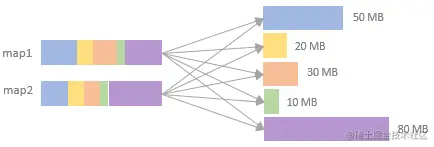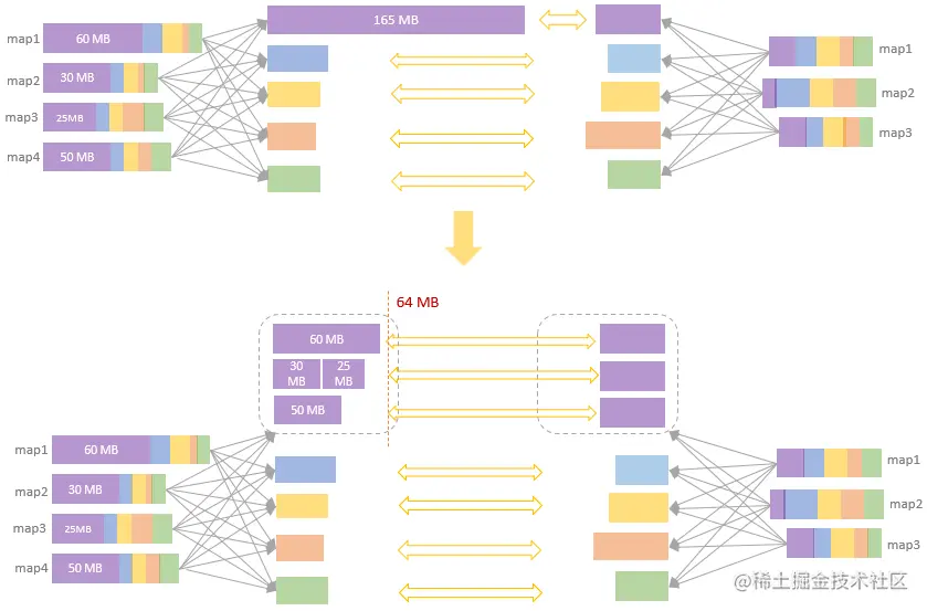 With the target size ready, the CoalesceShufflePartitions rule can start to coalesce the partitions according to the target size and to define the coalesced partition specs (CoalescedPartitionSpec) which will be used to create shuffle reader later. Let’s use an example to explain this process. As the diagram shows below, we have a shuffle operation with two input partitions on the map side. When the CoalesceShufflePartitions rule is not applied, the shuffle data are read into five output partitions, even though some of them are small.