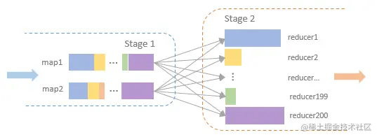 The reason behind the 200 tasks is that the number of shuffle partitions is fixed during a spark job execution with the default value as 200. The number of shuffle partitions determines the number of buckets into which a mapper task writes and the number of output partitions on the reducer side.