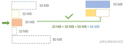 The CoalesceShufflePartitions rule moves on to add the second and the third partitions, resulting at 50MB which is smaller than the target size.