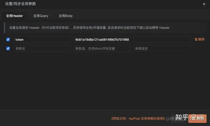 例如:常见的 token 令牌参数,假使我们请求项目下的任何接口都需要在 header 带上 token 参数,那么我们当然可以每个接口的 header 参数都写一个 token,但是这样的话十分不利于后期维护、修改。