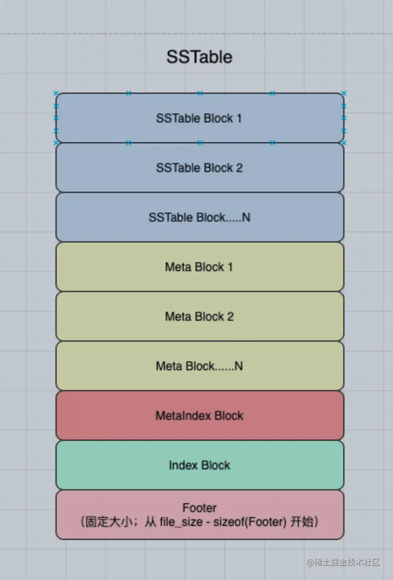 - 文件的最后是一个固定长度的页脚,其中包含元索引和索引块的 BlockHandle 以及一个幻数。