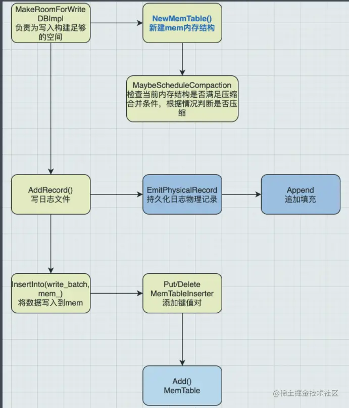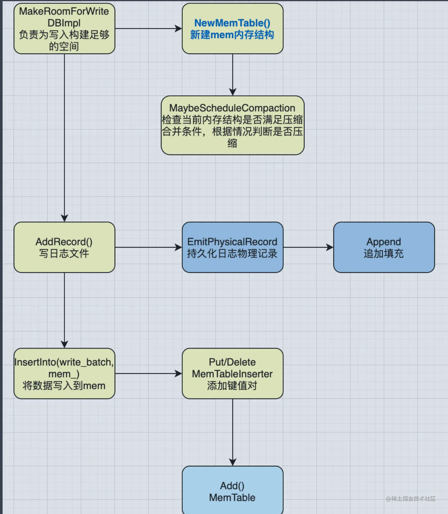 AddRecord方法向日志中追加一条写操作记录。 - 最终调用memtable往内存结构中添加key/value,完成最终写入操作。
