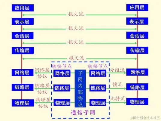 应用层 确定进程之间通信的性质以满足用户需要以及提供网络与用户应用软件之间的接口服务 表示层 加密 压缩等处理 传输格式(二进制 ASCII码)乱码是表示层问题(开发者处理) 会话层 提供包括访问验证和会话管理在内的建立和维护应用之间通信的机制 传输层 负责获取全部信息 网络层 主要负责网络中两台主机之间的数据交换 数据链路层 主要负责在相邻节点间的链路上无差错地传送信息帧 物理层 主要功能是确保二进制数字信号0和1在物理媒体上的正确传输