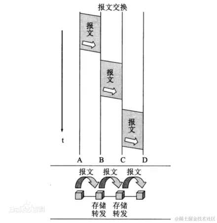 报文整个地发送,一次一跳,即中间结点一口气吃掉数据又一口气向下一个结点发送数据