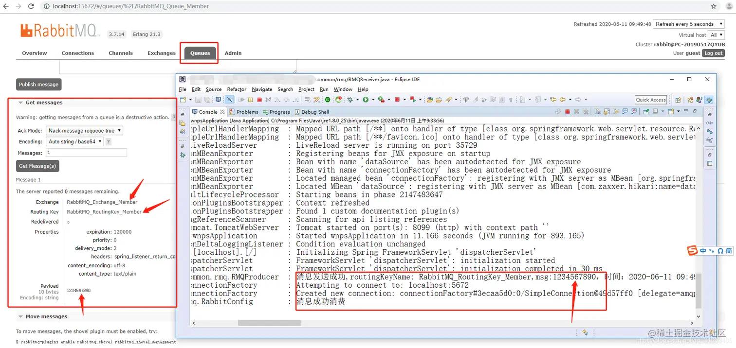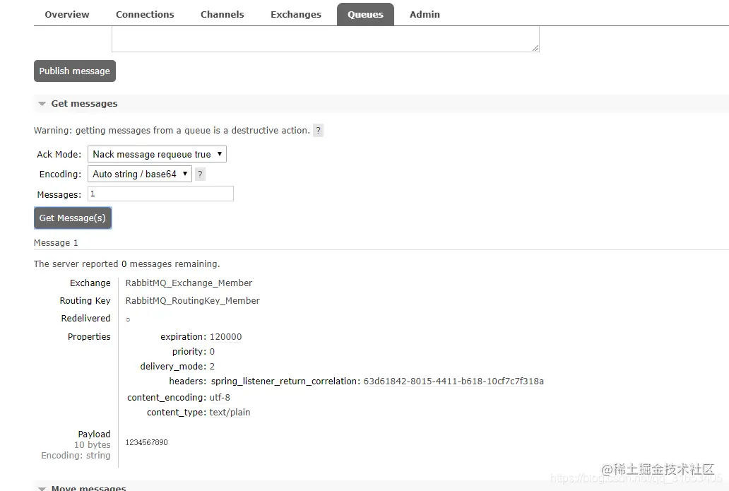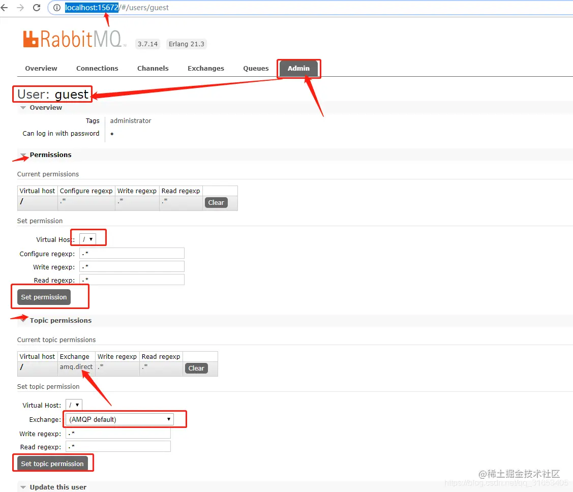 在rmq安装成功之后,浏览器输入http://localhost:15672,账号密码:guest/guest登录之后,给这个guest账号设置初始交换机(代码中默认设置的交换机,我的是:EXCHANGE_Member)的权限,这个问题注意下,要不一直提示: