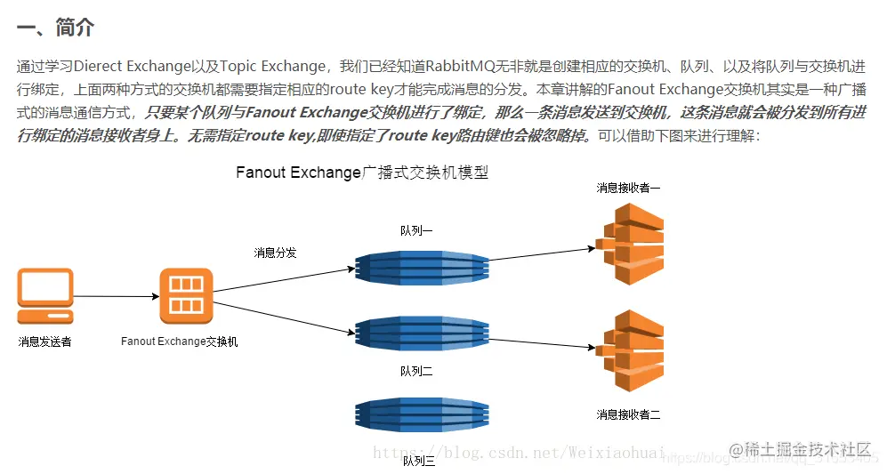* FanoutExchange: 将消息分发到所有的绑定队列,无routingkey的概念
