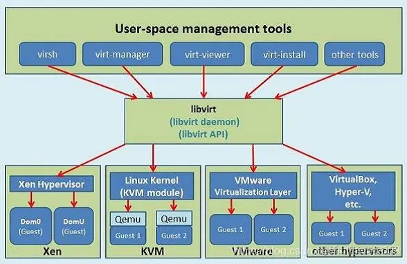 libvirt是目前使用最为广泛的对KVM虚拟机进行管理的工具和API。Libvirtd是一个daemon进程,可以被本地的virsh调用,也可以被远程的virsh调用,Libvirtd调用qemu-kvm操作虚拟机。