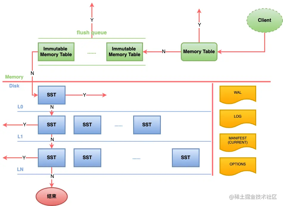 按照 memtable --> Level 0 SST–> Level 1 SST --> … -> Level n SST的顺序读取数据。这和记录的新旧顺序是一的。因此只要在当前级别找到记录,就可以返回。流程如下: