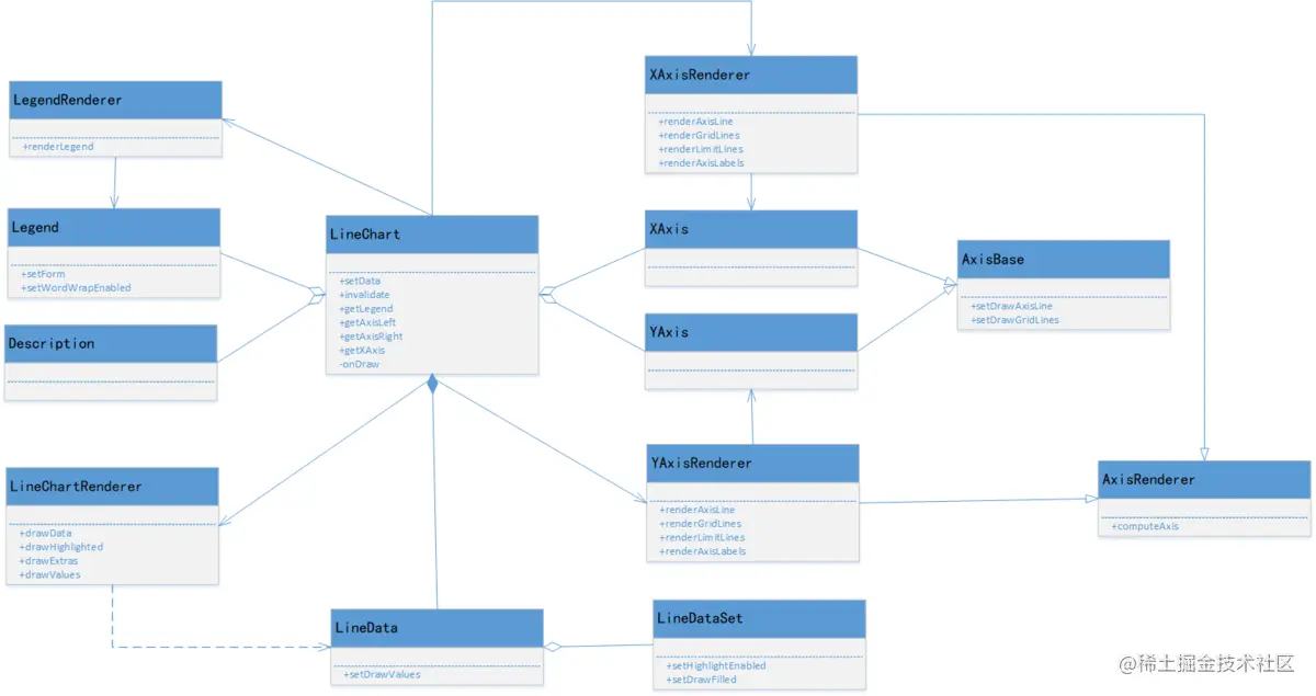 LineChart对象中存储了图例、描述、数据轴、数据等绘制图表所需的数据,并在内部创建对象的renderer对象。在onDraw方法中,分别调用各种renderer对象进行图表中各元素的绘制。