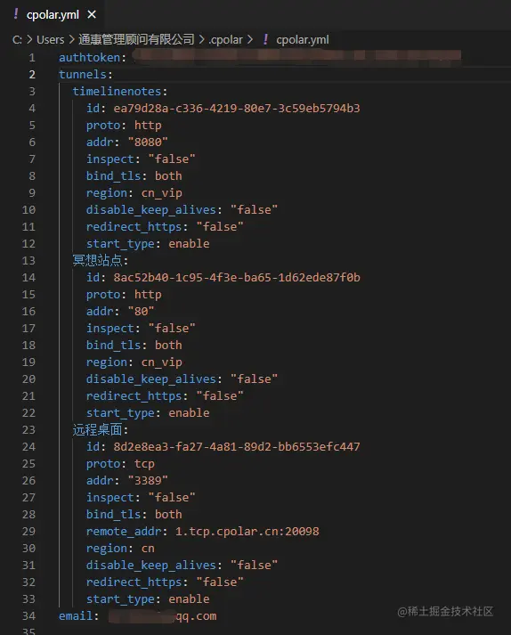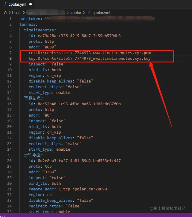 在放置好网站安全文件后,我们要记住这些安全文件的路径,然后打开VS code,对cpolar的配置文件进行修改,让cpolar知道这两个安全文件所在位置,使其能够在有需要时进行调用。