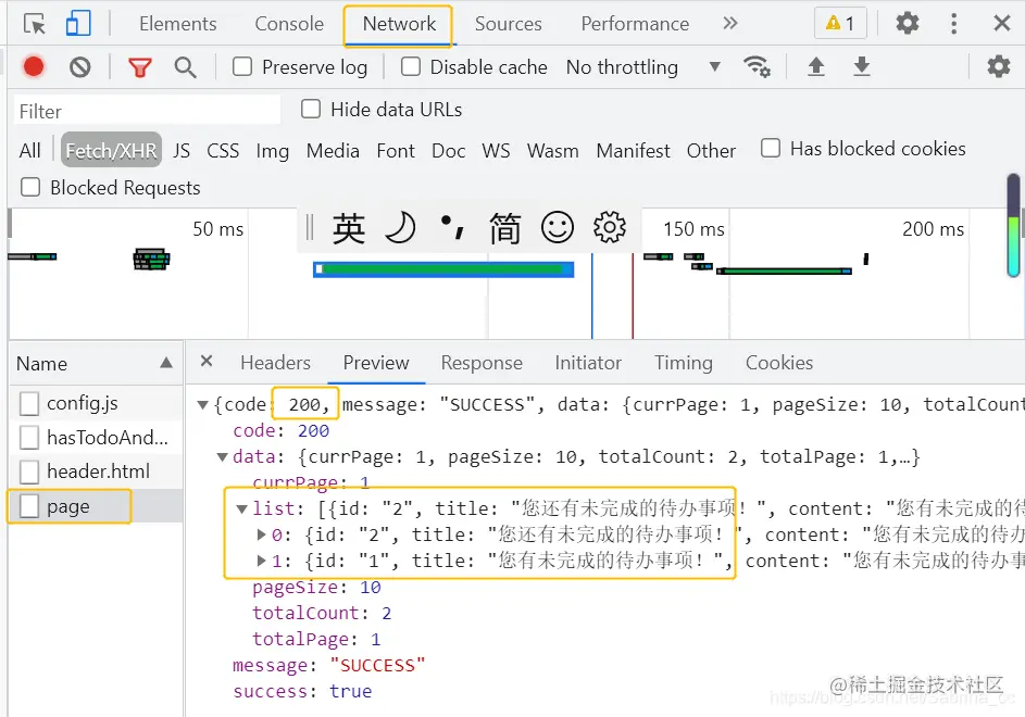 打开浏览器开发者工具F12在network-XHR可以看到请求情况为200,并且返回了两条数据。