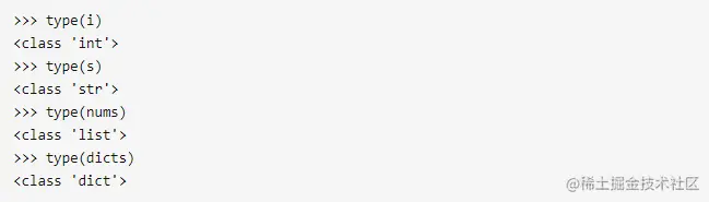 比如上面 i 的类型是 int 类型,s 类型是字符串类型,nums 的类型是列表类型,dicts 的类型是字典类型,它们都是由对应的类型构建出来的。