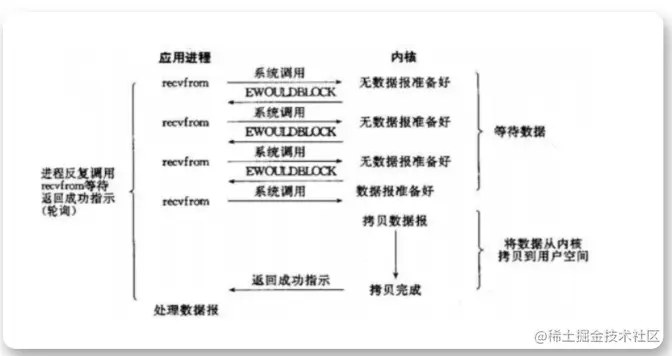 在系统调用内核后,内核如果没有准备好数据,则直接会返回一个错误码,直到数据准备好后,再走后续的流程