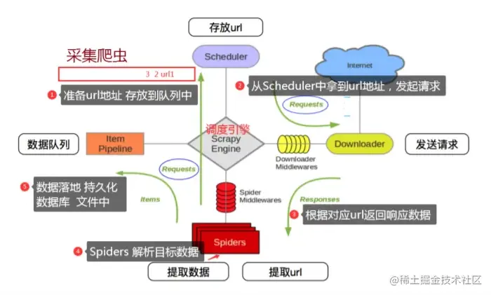 3️⃣ spider模块通过engine模块分别达到item pipelines模块 和 scheduler模块