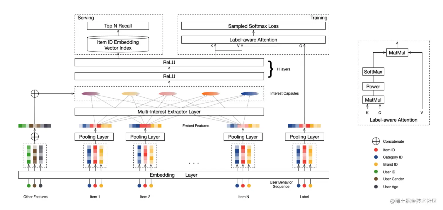 通过多兴趣提取层,多个兴趣胶囊从用户行为embedding建立。在训练期间,通过一个标签意识注意力层让标签物品选择使用过的兴趣胶囊。特别的,对于每一个标签物品,我们计算兴趣胶囊和标签物品embedding之间的相似性,并且计算兴趣胶囊的权重和作为目标物品的用户表示向量,通过相应的兼容性确定一个兴趣胶囊的权重,这里和DIN中的Attention几乎一样,但key与value的含义不同。其中目标物品是query,兴趣胶囊既是keys也是values.