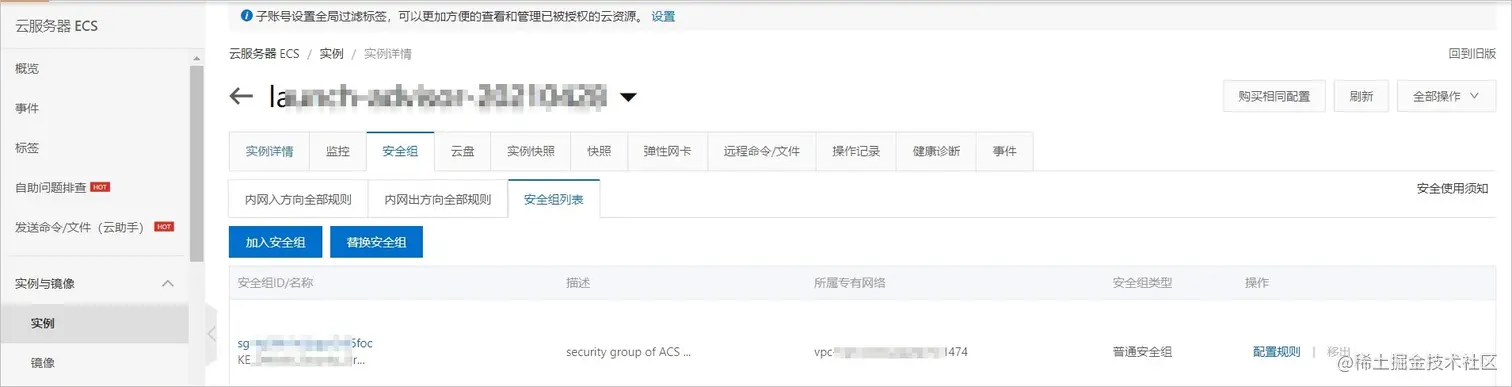 在实例详情单击安全组,然后在安全组列表中,单击相应的安全组ID。