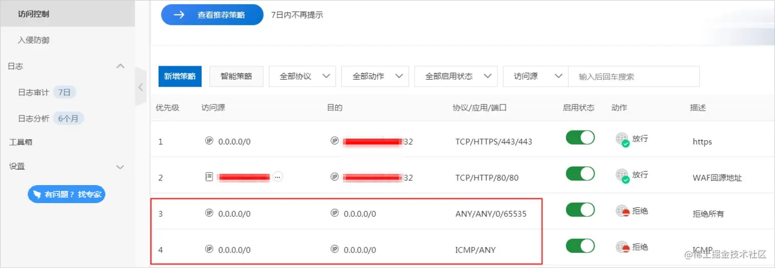 如果外网无法ping通和访问服务器的端口,但从服务器访问外网时一切正常,检查是否使用了云防火墙。如果使用了云防火墙,请登录云防火墙控制台。在访问控制中,检查是否有从外到内的拒绝规则,禁止端口访问和ICMP协议。