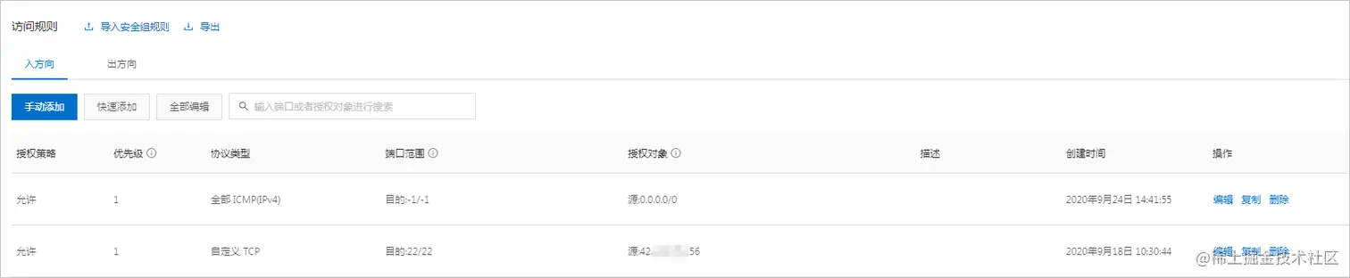 在安全组规则页面,单击入方向,检查是否有添加ICMP协议。如果没有房型,则需要添加安全组规则,详情可在阿里云国际版官网文档与帮助中搜索:添加安全组规则。