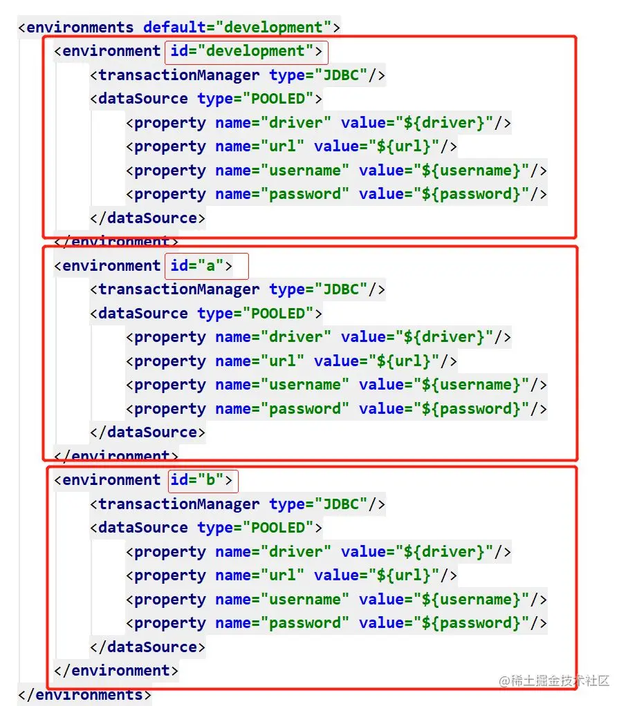这里的配置指的是数据源的配置,JDBC连接数据库需要四个参数,在Mybatis中这四个参数是配置在核心配置文件中的。在配置文件中是可以配置多套数据源的,如果不指定数据源的情况下会使用默认的数据源。