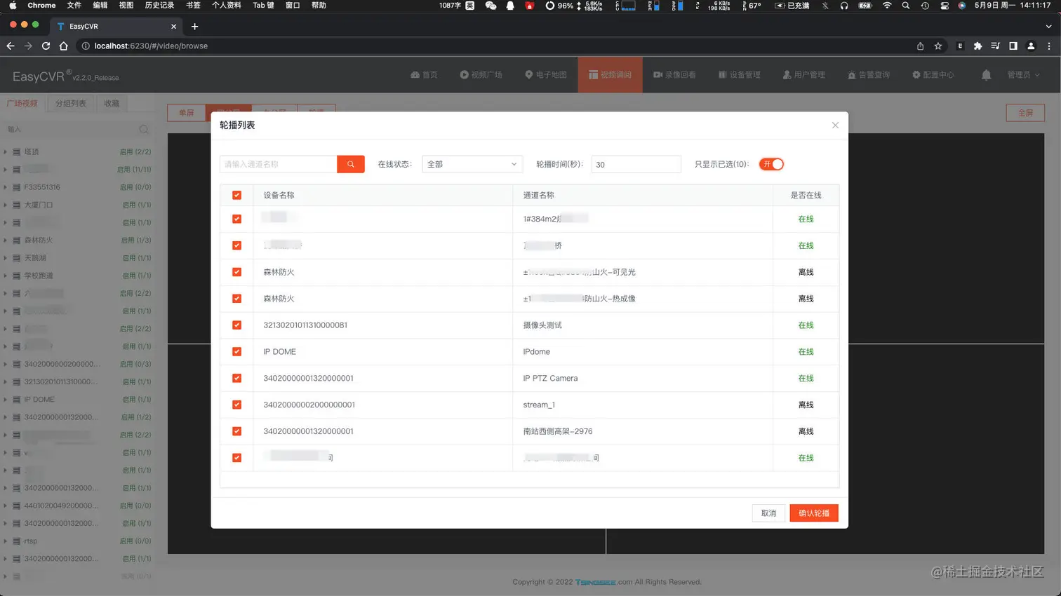 EasyCVR的视频轮巡功能是指,在视频调阅的画面分屏中,用户可以自定义设置需要播放的通道和设置轮巡时长,实现定时轮播视频,画面支持1、4、9、16四种。通过轮巡功能用户可以自动观看多路通道的视频,可适用于不间断需要人工查看的监控场景,比如社区安防监控、商场监控、校园安防、森林防火、道路交通、水利、景区等场景中。