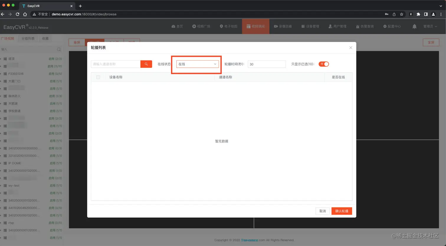 在轮巡选择通道时,全部状态切换成在线状态后,数据筛选出来为空,如图所示: