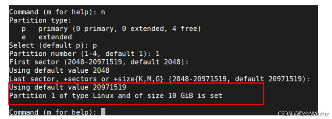步骤 5 以创建一个主要分区为例,输入“p”,按“Enter”,开始创建一个主分区。以分区编号选 择“1”为例,输入主分区编号“1”,按“Enter”。