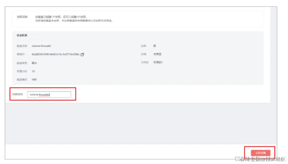 步骤 3 创建快照名字为 volume-linuxdata。