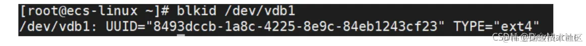 blkid 磁盘分区,以查询磁盘分区“/dev/vdb1”的 UUID 为例: