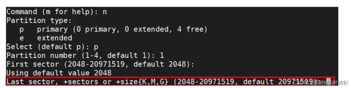 步骤 4 执行以下命令,进入 fdisk 分区工具,开始对新增数据盘执行分区操作。