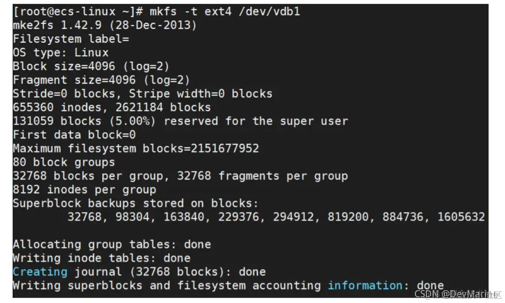 mkfs -t ext4 /dev/vdb1
