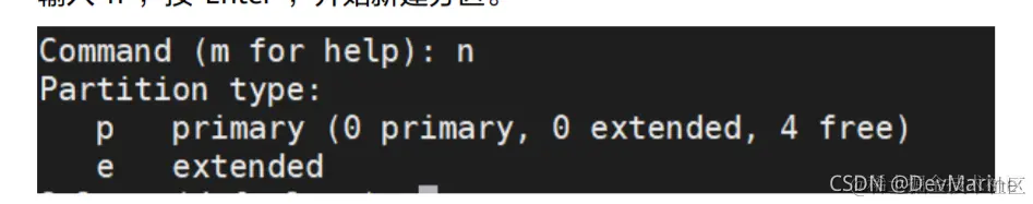 输入“n”,按“Enter”,开始新建分区。