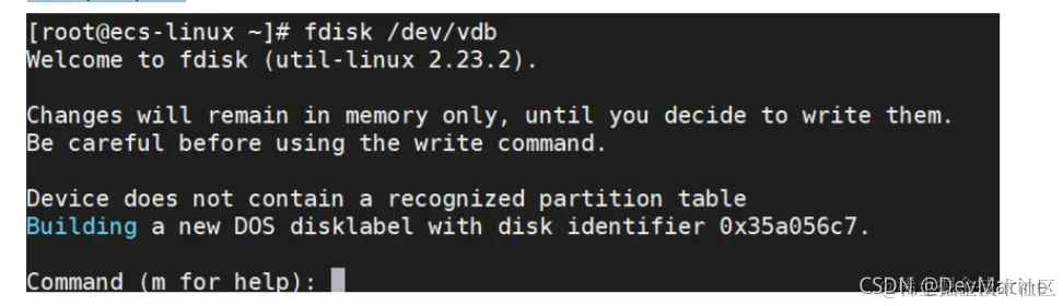 fdisk 新增数据盘,以新挂载的数据盘“/dev/vdb”为例: