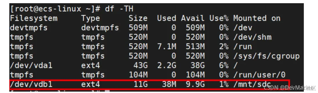 表示新建分区“/dev/xvdb1”已挂载至“/mnt/sdc”。