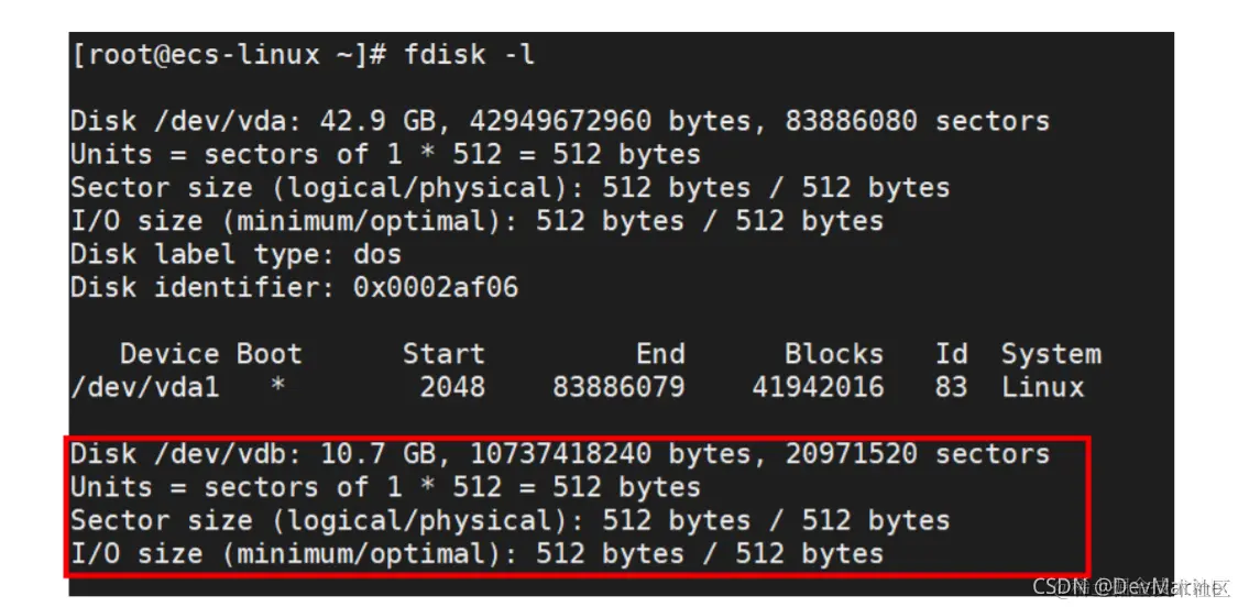 表示当前的云服务器有两块磁盘,“/dev/vda”是系统盘,“/dev/vdb”是新增数据盘。