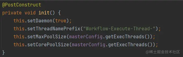 这个线程池交给了spring管理,而且属于后台线程。它的最大数量以及核心数量的线程池都是100个(MasterConfig.getExecThreads)。详细如下图: