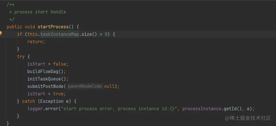 StartProcess就干了三件事请,buildFlowDag()构建了DAG,initTaskQueue()初始化task队列以及submitPostNode()提交节点的。