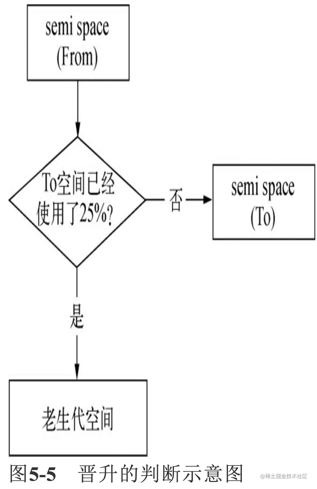 将该对象从From空间复制到老生代空间中,如果没有,则复制到To空间中。另一个判断条件是To空间的内存占用比。当要从From空间复制一个对象到To空间时,如果To空间已经使用了超过25%,则这个对象直接晋升到老生代空间中,这个晋升的判断示意图如下图: