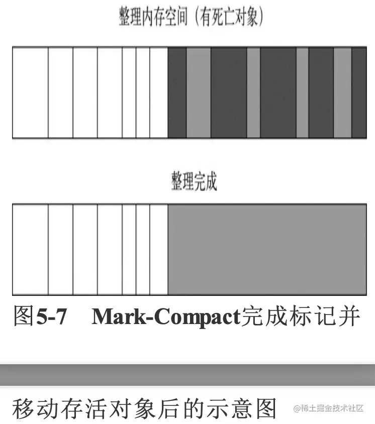 Mark-Sweep最大的问题是在进行一次标记清除回收后,内存空间会出现不连续的状态。这种内存碎片会对后续的内存分配造成问题,因为很可能出现需要分配一个大对象的情况,这时所有的碎片空间都无法完成此次分配,就会提前触发垃圾回收,而这次回收是不必要的。为了解决Mark-Sweep的内存碎片问题,Mark-Compact被提出来。Mark-Compact是标记整理的意思,是在Mark-Sweep的基础上演变而来的。它们的差别在于对象在标记为死亡后,在整理的过程中,将活着的对象往一端移动,移动完成后,直接清理掉边界外的内存。Mark-Compact完成标记并移动存活对象后的示意图,白色格子为存活对象,深色格子为死亡对象,浅色格子为存活对象移动后留下的空洞。