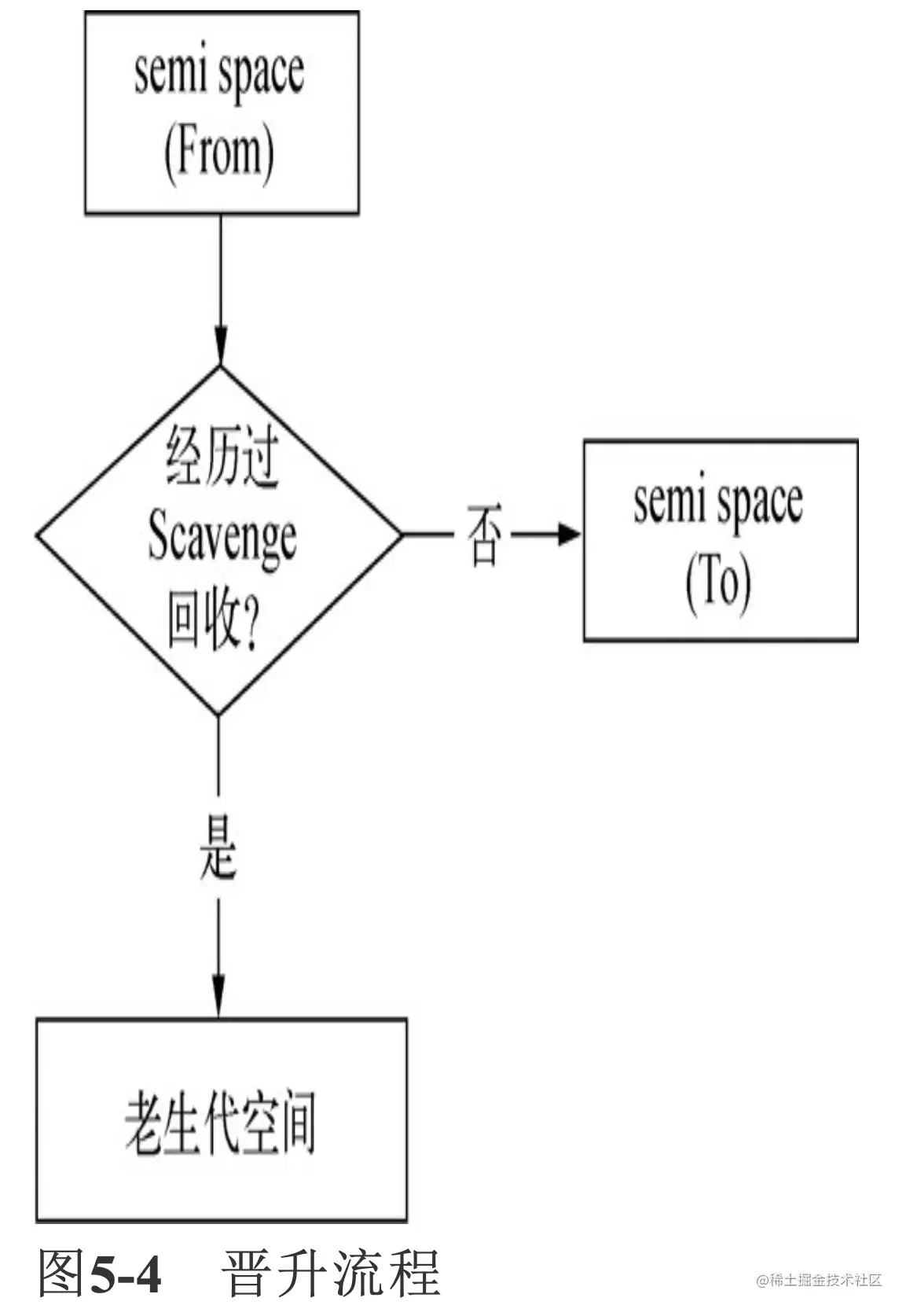 当一个对象经过多次复制依然存活时,它将会被认为是生命周期较长的对象。这种较长生命周期的对象随后会被移动到老生代中,采用新的算法进行管理。对象从新生代中移动到老生代中的过程称为晋升。在单纯的Scavenge过程中,From空间中的存活对象会被复制到To空间中去,然后对From空间和To空间进行角色对换(又称翻转)。但在分代式垃圾回收的前提下,From空间中的存活对象在复制到To空间之前需要进行检查。在一定条件下,需要将存活周期长的对象移动到老生代中,也就是完成对象晋升。