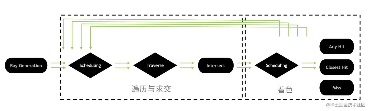 光线追踪Ray Tracing是一项几十年前就有的技术,但是因为计算量太大,而无法实现实时渲染。因为RTX显卡的出现,让实时光线追踪这个概念再次得到了关注。光线追踪是路径追踪的一种简单形式,但是这两个概念本质上都是一种数学算法。光线追踪着色器(Ray Tracing Shaders)就是特意为光线追踪这种数学算法而设计的,它由很多特殊着色器模块的组合而成。下图是RTX光线追踪的架构图:developer.nvidia.com/rtx/ray-tra…