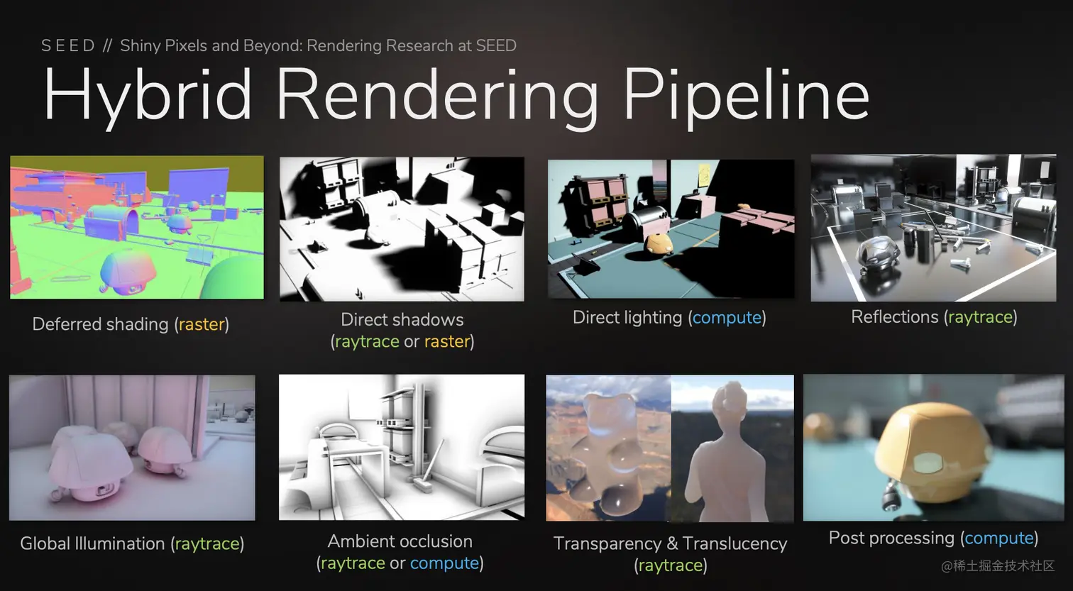 三种计算承载方式:光栅化,计算着色器和光线追踪着色器都已经介绍完了。它们之间并不是谁要代替谁,也没有一种完美的方法。而应该对于不同的场景,运用不同的方法。所以,对于混合渲染的概念,相信大家也更加清晰了。只要混合使用了不同渲染方法的渲染管线,我都可以理解成是混合渲染的一种体现。developer.nvidia.com/blog/video-…