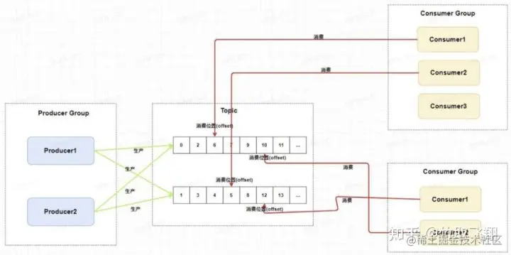 - 分组(Group) :一个组可以订阅多个 Topic,包括生产者组(Producer Group)和消费者组(Consumer Group)。