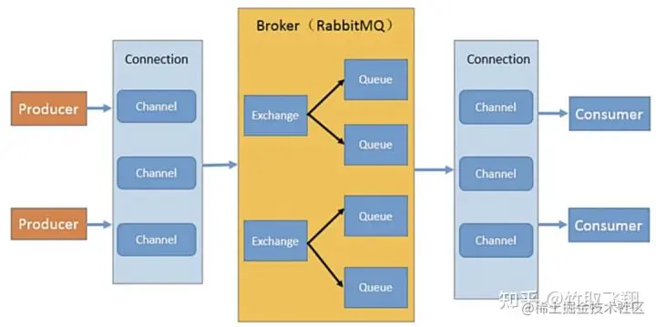 - Broker:消息处理中心,负责消息存储、确认、重试等,一般其中会包含多个 Queue;