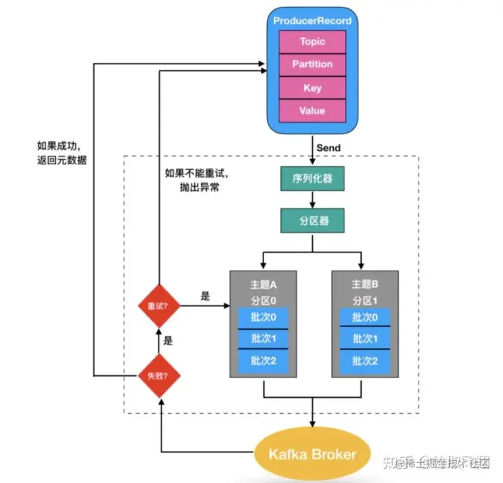 相同主题和分区的消息,会被存放在同一个批次里,然后由一个独立的线程负责把它们发到 Kafka Broker 上。