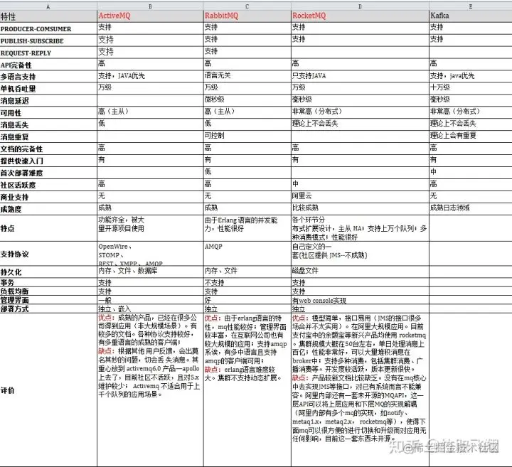 - ActiveMQ:官方社区现在对 ActiveMQ 5.x 维护越来越少,较少在大规模吞吐的场景中使用。