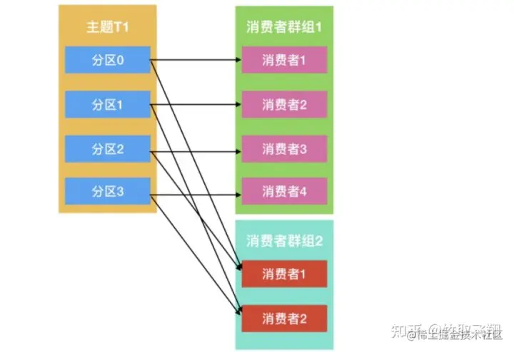 不同的消费群组互不干涉,比如下图的 2 个消费群组,可以分别消费这 4 个分区的消息,互不影响。