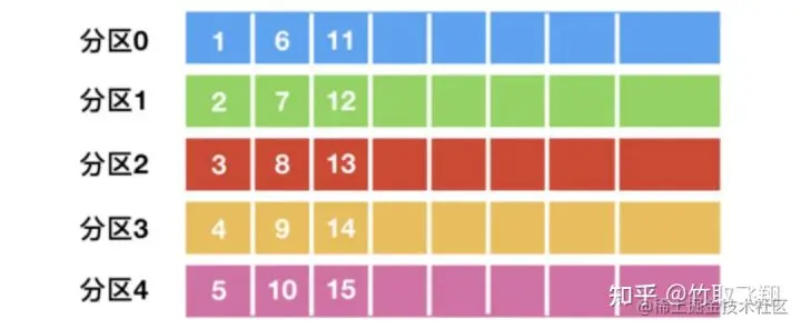 分区是 Kafka 读写数据的最小粒度,比如主题 A 有 15 条消息,有 5 个分区,如果采用顺序轮询的方式,15 条消息会顺序分配给这 5 个分区,后续消费的时候,也是按照分区粒度消费。