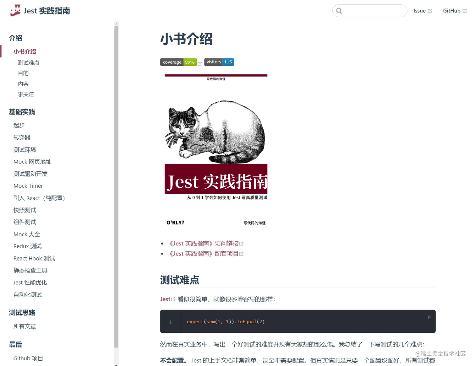 前段时间一直在给公司项目引入 Jest,这过程中学到了不少东西,也查了很多相关资料。最后编写了一本小书《Jest 实践指南》, 希望能帮助到想了解和学习前端测试的朋友。