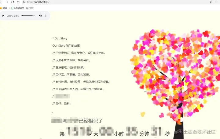 在有了网页运行环境后,我们就能将一个网页(包括其中的内容),放入这个运行环境中,让这个网页在本地电子设备上运行起来。此时我们可以借助开源的力量,找到一个适合表白和纪念的开源网页,将这个网页添加到我们的运行环境中,就能让这个网页为我们所用。此处我们使用gitee.com/selfeasy/lo…这个资源(在此感谢原作者慷慨开源)。